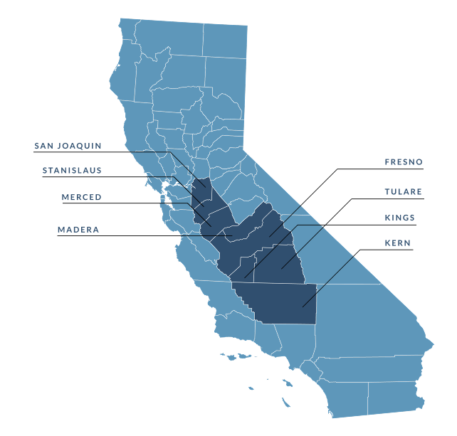 All eight counties of the Central Valley – Kern, Tulare, Kings, Fresno, Madera, Merced, Stanislaus, and San Joaquin Counties.